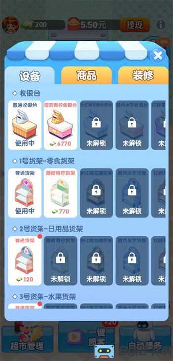 3.随意的去打扮属于自己的超市,能够得到各种各样的物品,达到一定的等级之后,还能解锁自助服务。