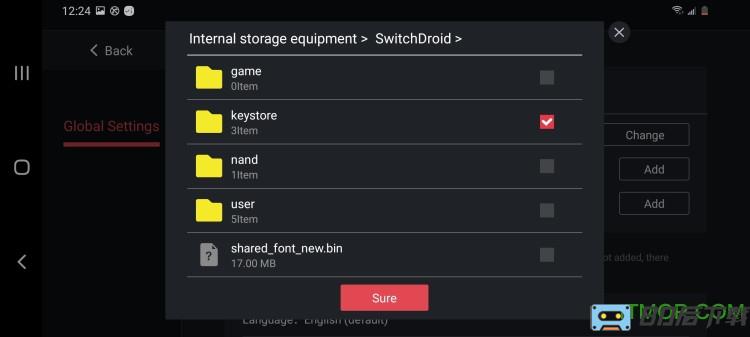 该SwitchDroid文件夹包含子文件夹3和一个bin文件。包含KEY文件的密钥库文件夹。Bin文件,它是字体支持文件。游戏ROM文件的游戏文件夹(这是一个空白文件夹,可以是XCI格式和NSP格式的游戏)。