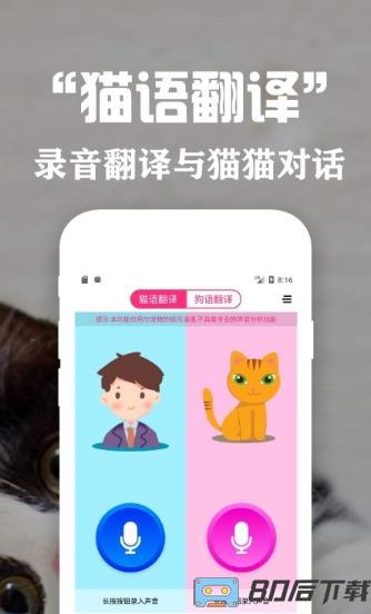 4、人猫狗翻译,长按录人声,输入你想对猫咪或狗狗说的话,立马转化成猫狗语,翻译给它听。
