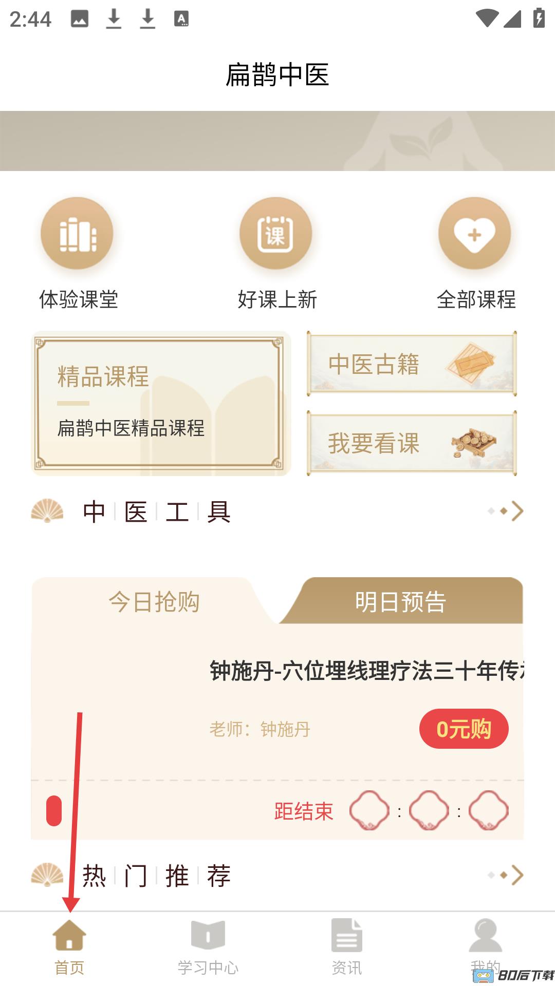 1、首页设有体验课堂与精品课程等入口,提供中医古籍阅读及限时抢购活动。