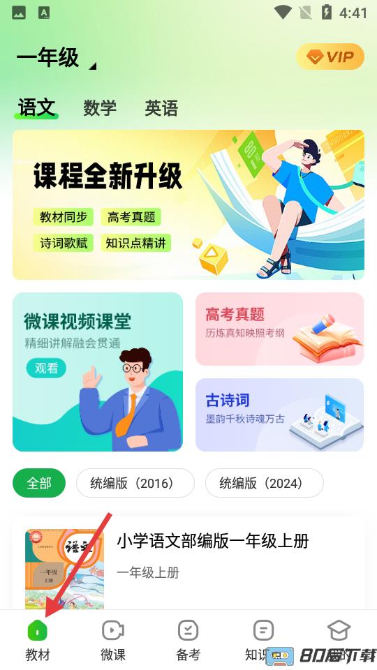 1、教材页面聚焦一年级全科课程,语文数学英语分类清晰,提供全新升级内容。