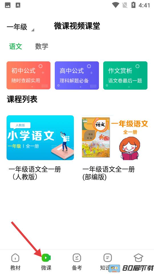 2、微课视频课堂分学科展示教学重点,包含实用公式详解与优秀作文赏析模块。