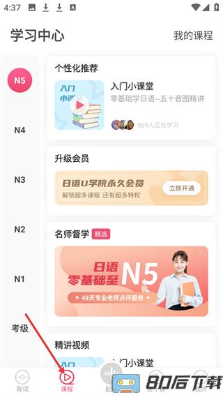 2、课程中心按日语等级划分学习阶段,提供入门课程与会员专属名师精讲内容。