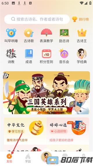 1、发现页面提供古诗检索与叫早哄睡等功能,包含三国系列等传统文化学习内容。