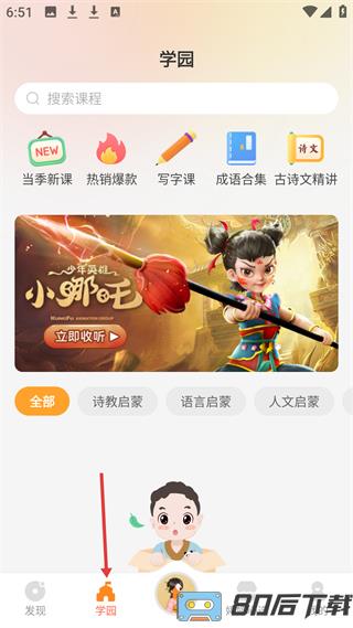 2、学园页面按季节推送新课与热门课程,覆盖诗教启蒙与语言训练等教学类型。