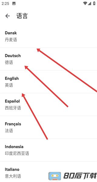 4、语言列表提供包括欧洲常用语种在内的多国语言,选定后自动生效并刷新界面显示。