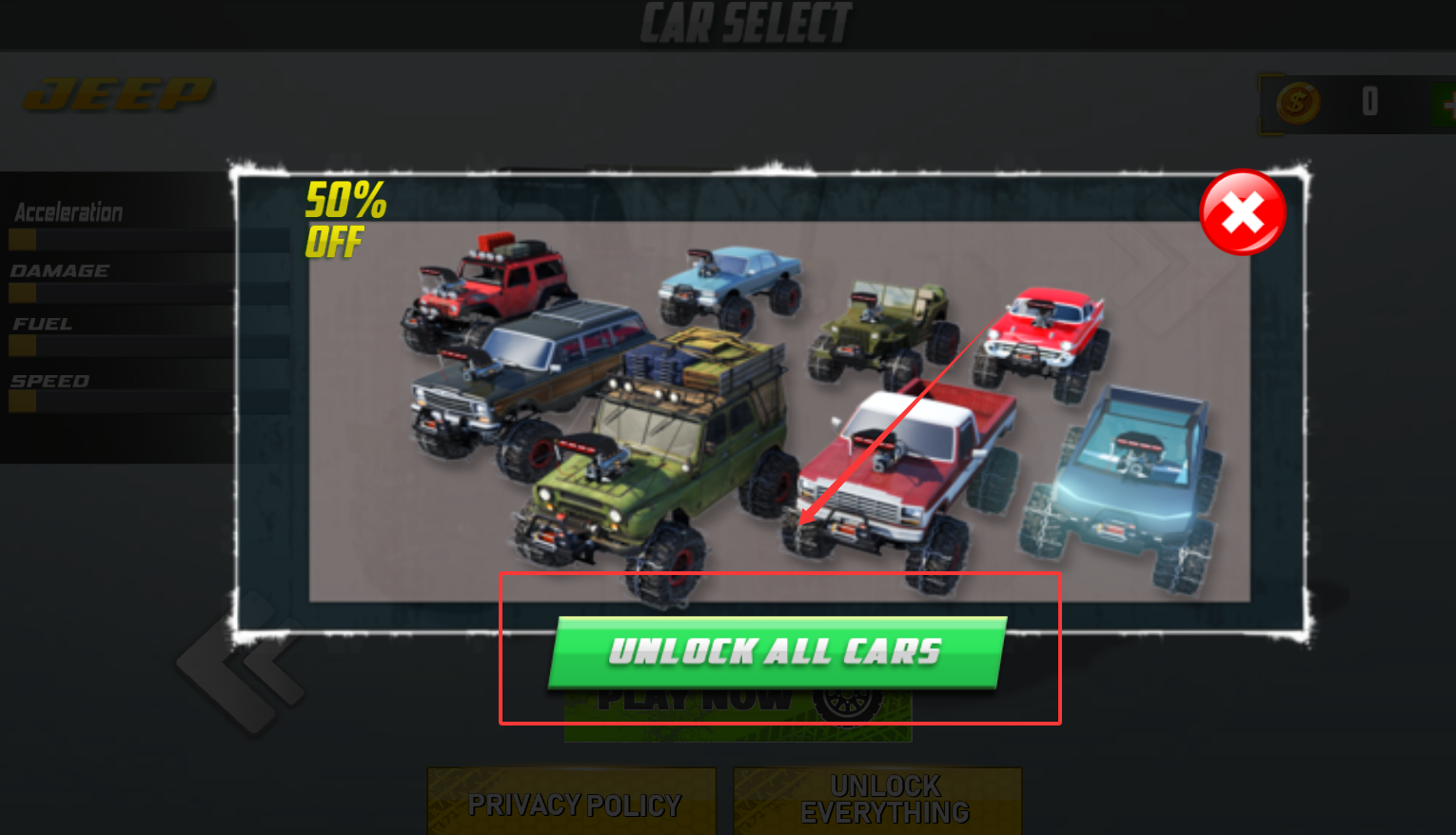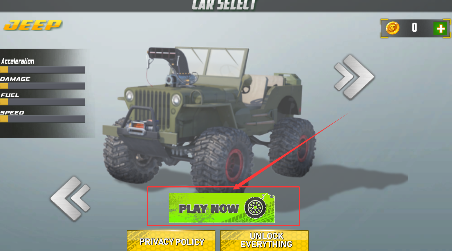 1、进入游戏后首先需要从车库内选择适合的越野车辆,每辆车的操控手感与性能参数都存在显著差异。