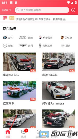 1、首页按地区展示婚车品牌与车队资源,支持直接搜索目标品牌筛选婚车。
