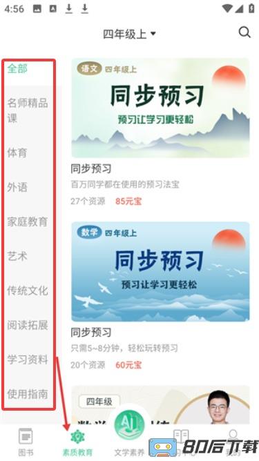 2、素质教育区提供同步预习资源,包含名师课程与体育等综合素质拓展内容。