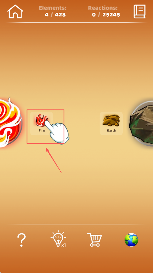 1、点击火元素图标开始组合实验,这是游戏的基础操作,需要熟悉元素拖拽和放置的基本技巧,为后续复杂合成打下基础。