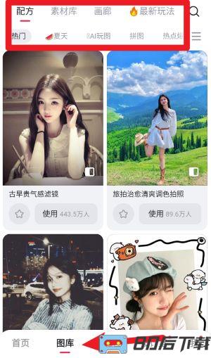 2、点击“图库”可浏览热门模板和滤镜,通过分类标签快速查找适合当前季节或风格的图片素材。