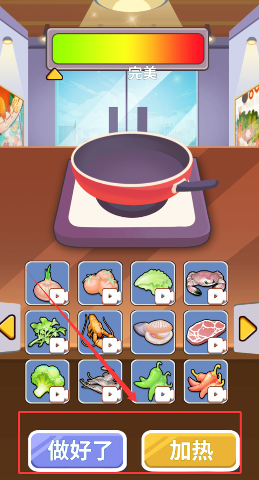 4、烹饪时直接点击食材将其放入锅中,通过长按加热键控制火候,瞄准屏幕上出现的完美区域以获取最佳效果。