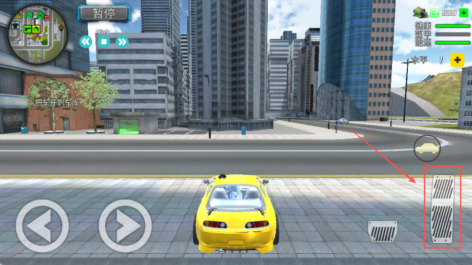 3、点击油门前进加速右下角的油门按键控制车辆加速前进,长按加速键提高车速,在城市街道上快速行驶,体验飙车的快感,追赶目标或完成限时任务。
