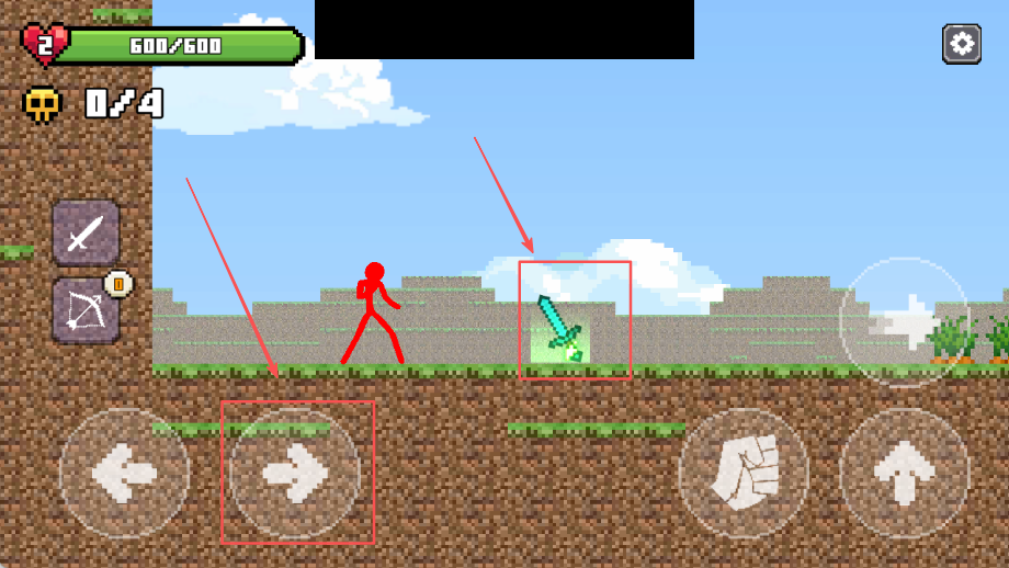 3、控制火柴人角色在地图中移动探索,找到散落的武器如大宝剑,靠近后自动拾取装备,获得更强的攻击力和新的技能,为战斗做好准备。