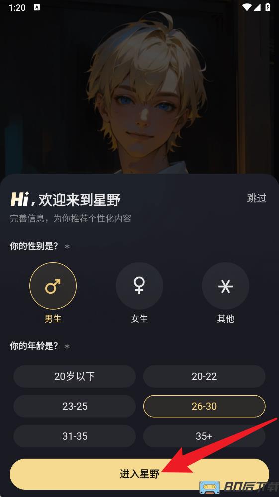 2、进入【性别与年龄选择】页面,用户可填写性别及年龄段,用于推荐个性化内容,完成后点击【进入星野】即可进入主界面。