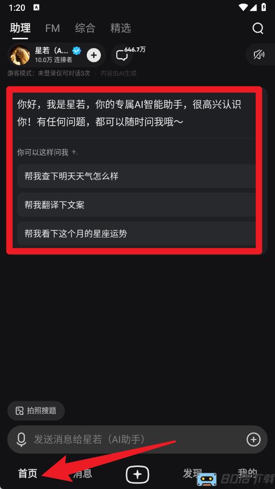 4、在【首页】,用户可与 AI 助理“星若”互动,获取天气查询、翻译文案、星座运势等功能。