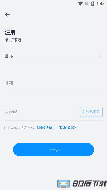 3.没有账号可以先注册新账号,点击下方注册键进入页面,需要填写个人邮箱获取验证码;