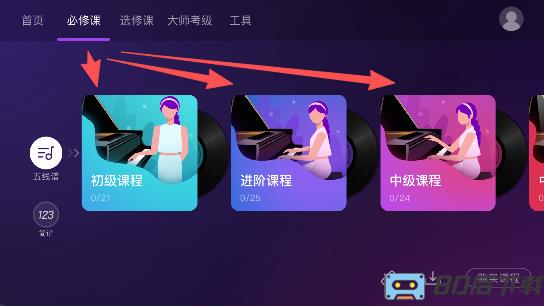 2.之后就会看见有三个课程与工具按键,必修课里有“初级课程,进阶课程与中级困难课程”;