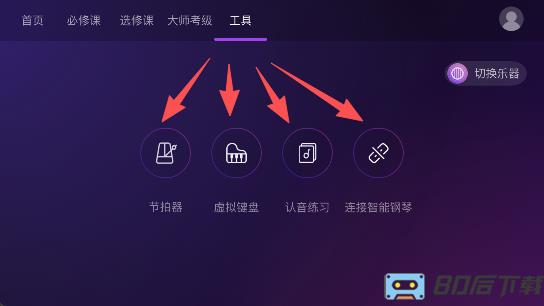 4.工具里有四个功能“节拍器,虚拟键盘,认真练习与连接智能钢琴”。