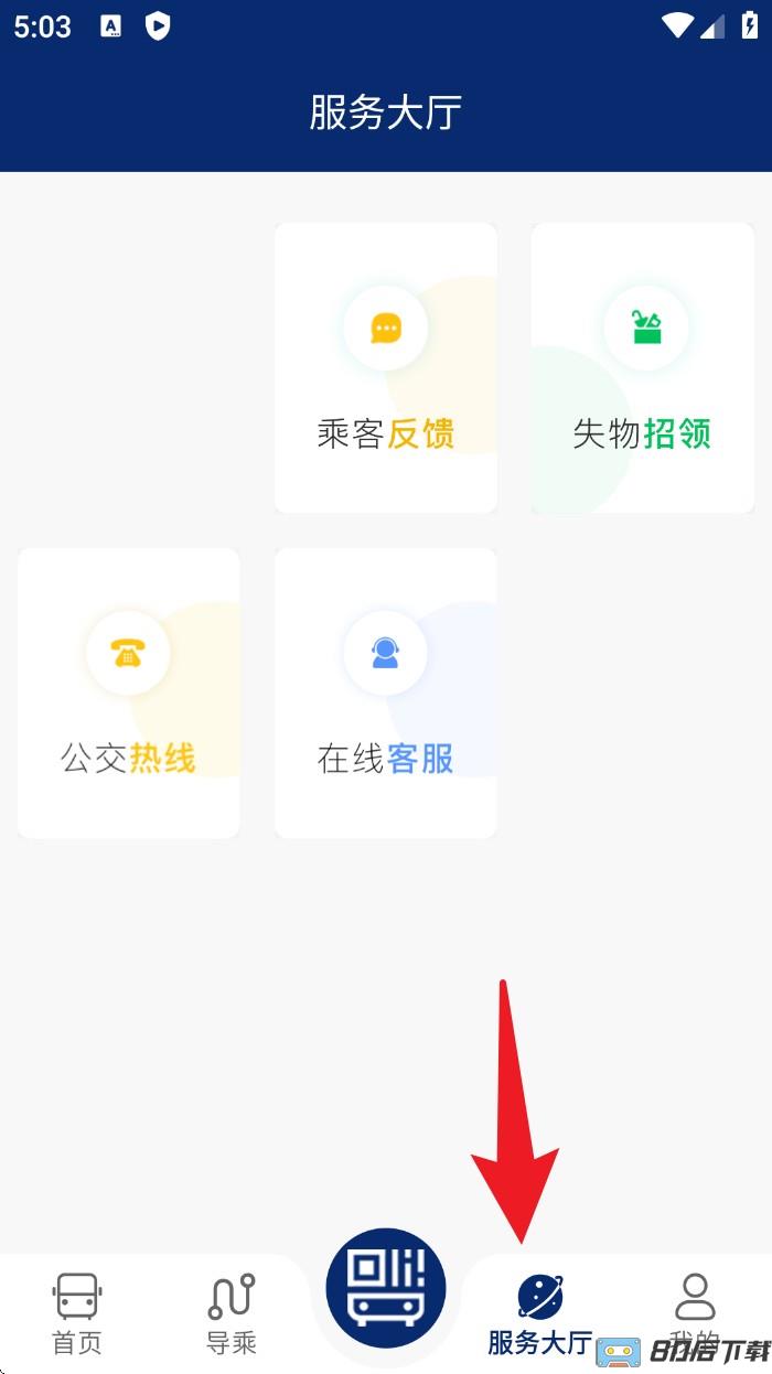 4. 进入“服务大厅”板块,可进行乘客反馈、失物招领、公交热线咨询及在线客服交流。