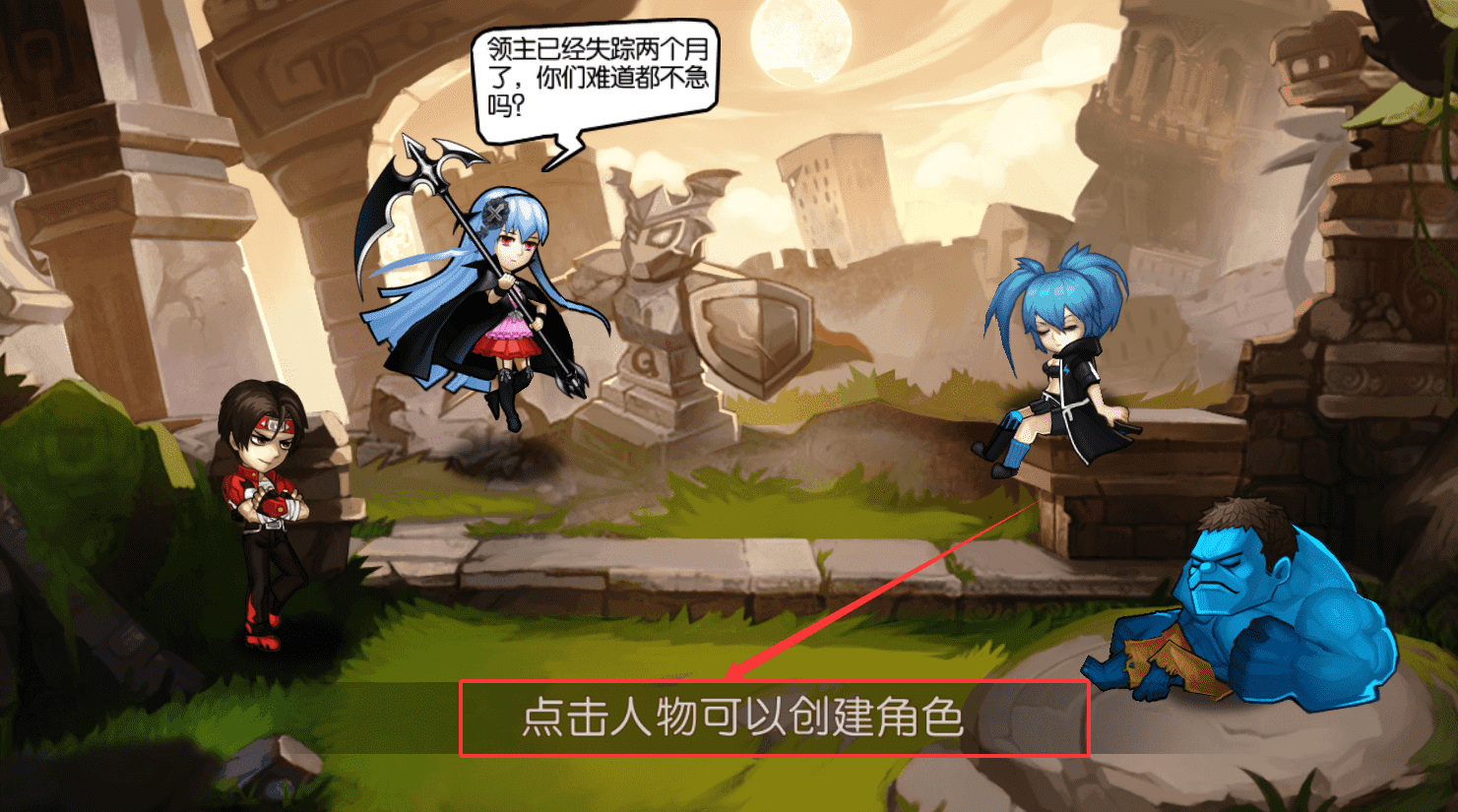 1、首先创建你的角色呢,点击屏幕上出现的人物就可以完成这一步了,游戏背景是领主失踪了两个月,故事正等待你来展开。