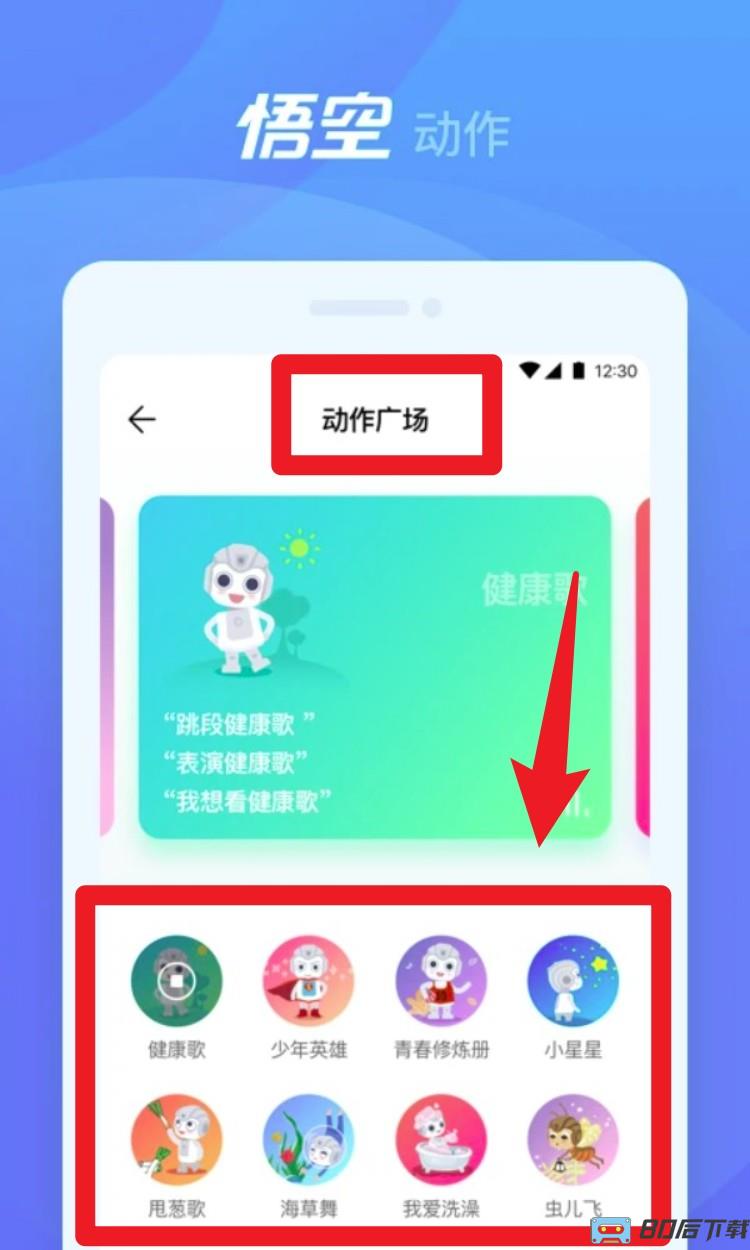 1. 进入首页点击「动作广场」,可选择如《健康歌》《我爱洗澡》等动作歌曲,让机器人跟着节奏舞动,陪伴孩子一起活动身体。