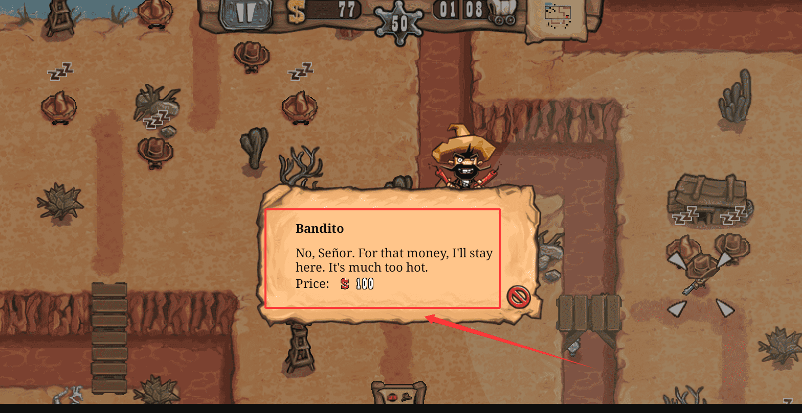 3、然后第一张图展示了一个具体的游戏情景,有角色“Bandito”和对话,提到金钱和天气太热,价格是800美元。