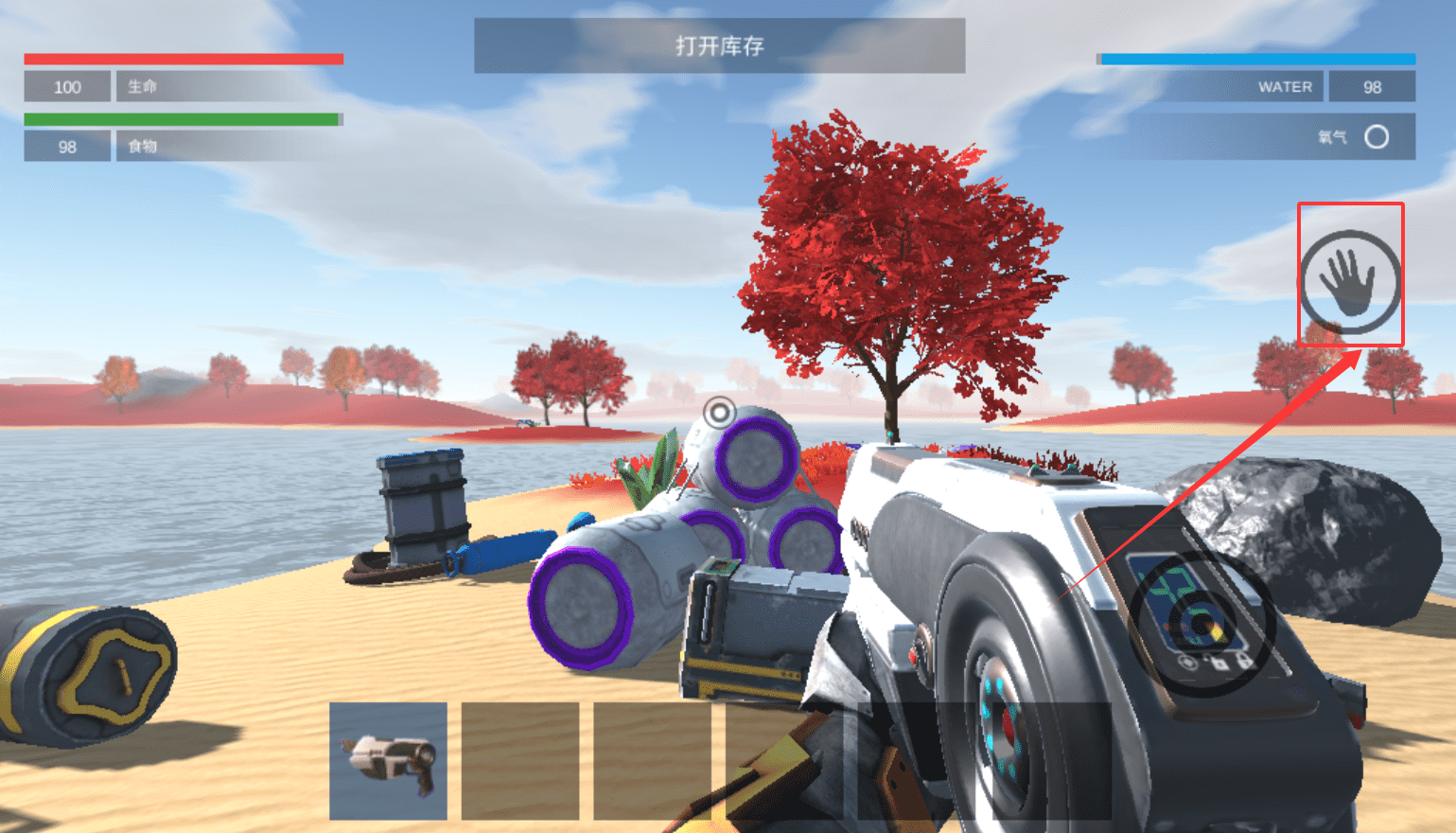 3、游戏开局后,你身处一个完全空荡的沙盒世界,需要关注屏幕上的生存指标。留意你的生命、食物和水分值。