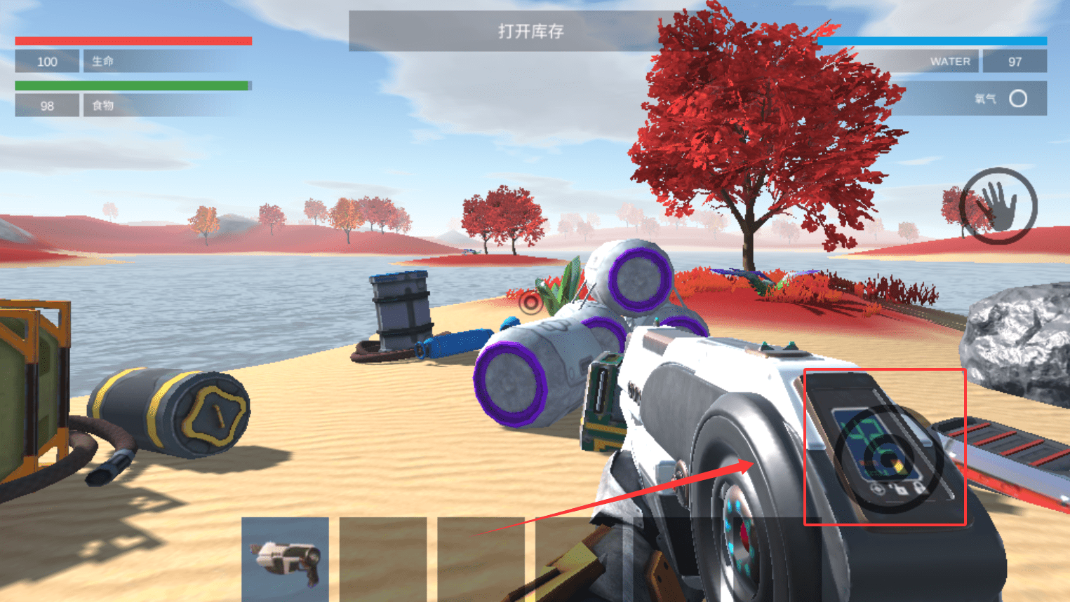 4、随时可以打开库存界面来查看详细状态。你会看到生命值、食物值和水分值的具体数字,比如生命100,食物98,水97。