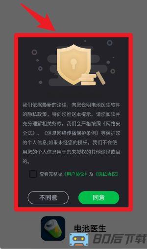 1、首次启动电池医生时,会弹出隐私协议和用户协议提示,用户需认真阅读并选择同意或不同意,以保障个人信息安全。