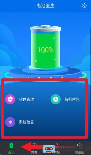 2、在首页界面,用户可查看电池实时电量,并进入软件管理、待机时间和系统信息等功能模块,全面掌握电池运行状况。