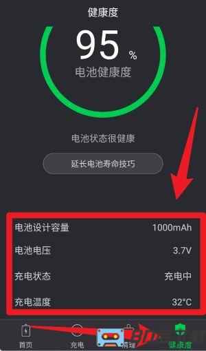 5、在健康度界面,用户能直观查看电池健康百分比及设计容量、电压、充电状态和温度等数据,便于科学管理和维护电池。