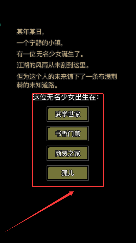 1、首先在创建角色时,要从四类出身中选择其一,比如武学世家、书香门第、商贾之家或孤儿,这会影响你的起点身份。