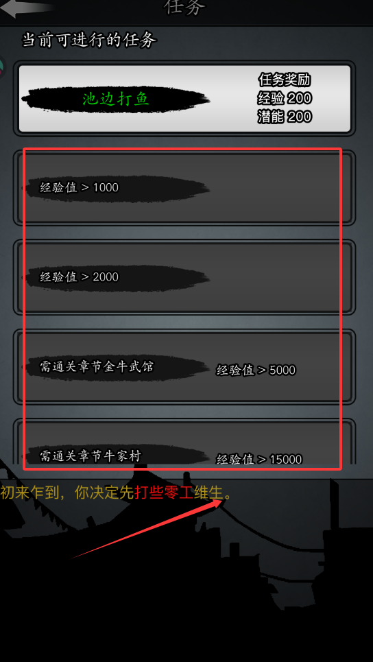 2、进入游戏后,记得先查看任务列表,比如最初的打零工任务,以及后续的池边打鱼等。