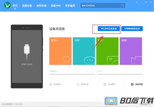 1、在电脑端打开华为手机助手,点击“WLAN无线连”功能选项以启动连接。