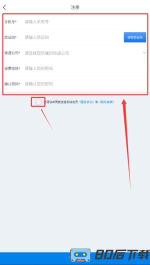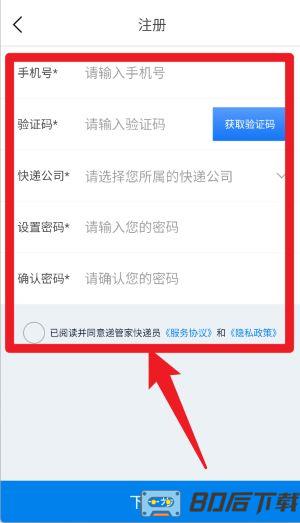 2、首次使用需进入注册页面,填写手机号、验证码、快递公司信息及密码,勾选同意服务协议与隐私政策后点击“下一步”完成注册。