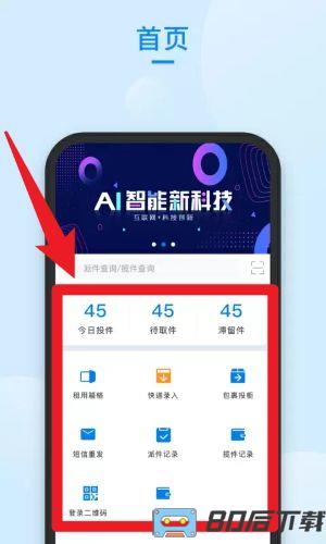 3、首页可查看今日投件、待取件与滞留件数量,并能快速进入租用邮箱、包裹投柜、短信群发等高效配送功能模块。