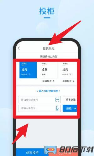 4、在包裹投柜界面选择所需格口类型,输入包裹信息及收件人手机号,确认无误后点击“投柜”完成投递操作。