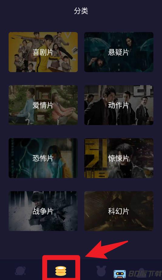 3、在分类页面,影视作品被细分为喜剧片、悬疑片、爱情片、动作片、恐怖片、惊悚片、战争片和科幻片,用户可以根据偏好选择。