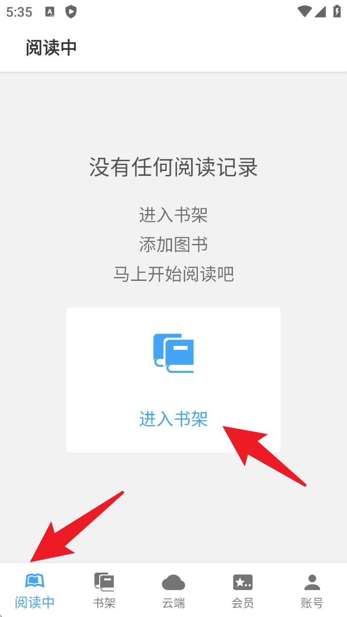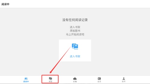 1. 打开应用后默认进入「阅读中」页面,如无阅读记录,可点击页面中的「进入书架」,添加图书开始阅读。