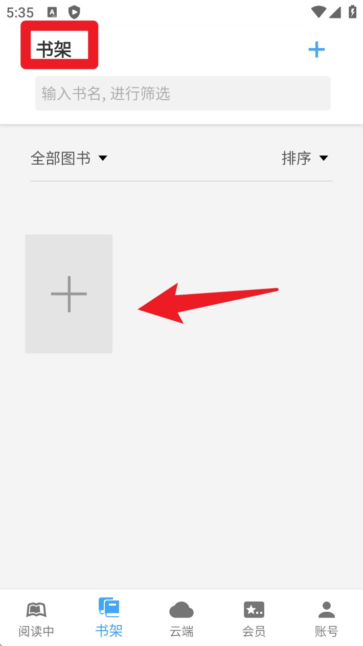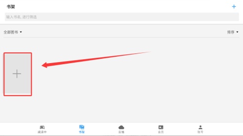 4、在书架页面点击添加按钮,即可从本地或书库中选择书籍导入。