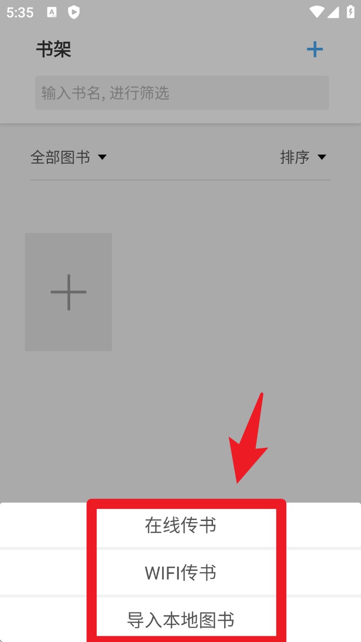 3. 点击书架右上角的「+」图标,选择「在线传书」、「WIFI传书」或「导入本地图书」以添加图书。