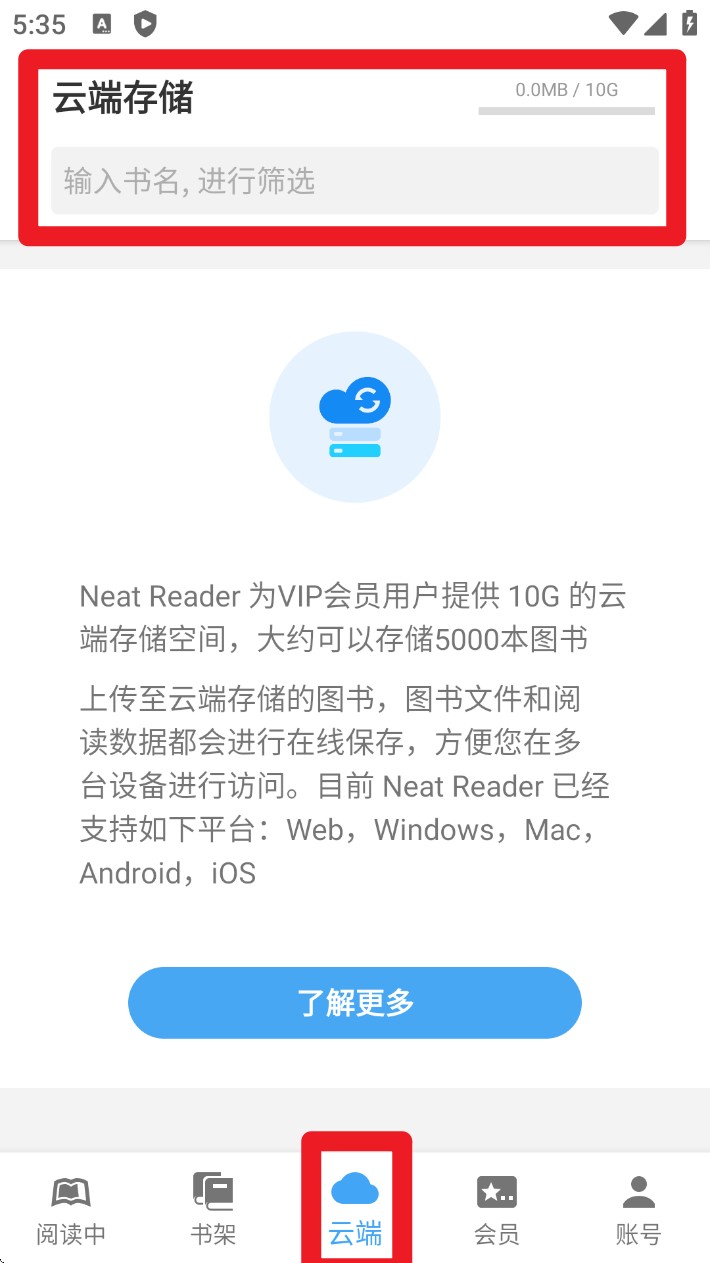 4. 点击底部「云端」可进入云端存储界面,支持上传图书至云端,VIP用户可享有10G存储空间,方便多设备同步阅读。