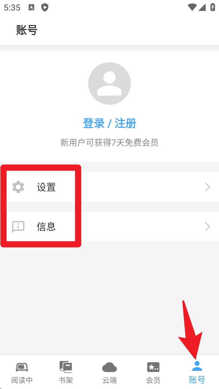 5. 点击底部「账号」进入个人中心,可登录或注册账户,并在「设置」中调整应用相关配置,在「信息」中查看应用信息。