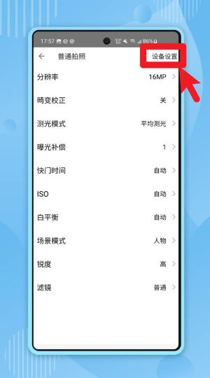 4、点击右上角的设置图标,进入详细参数调整页面以设定拍摄偏好。