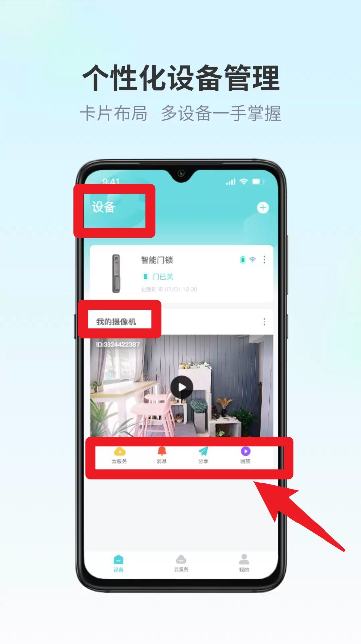 4. 视频服务:通过云视频服务,查看实时监控,调取回放画面。