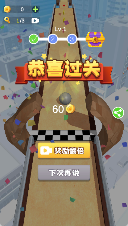 3、操控小球通过滚动、跳跃完成当前关卡目标后,系统将判定通关并展示得分。
