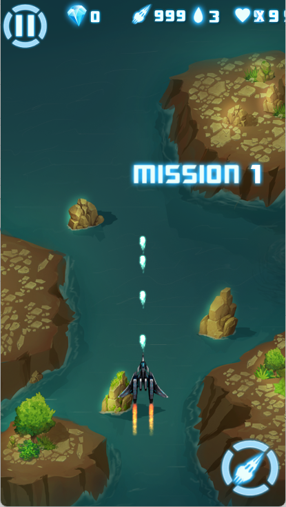 4、进入关卡后,通过虚拟摇杆控制战机移动,点击按钮进行射击、释放技能,完成战斗任务。