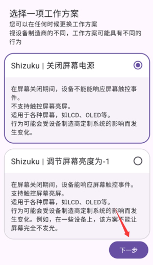 2、根据需求选择模式:如需完全后台挂机则选“关闭屏幕电源”;若需息屏保留触控则选“调节亮度为-1”。