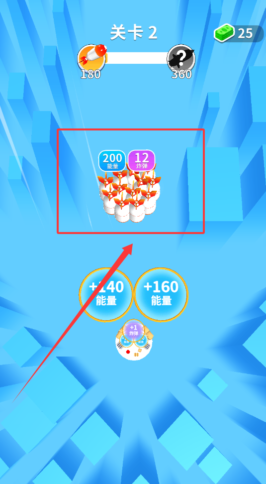 3、进入关卡2后要注意界面上的数字如25、180等,这些可能是目标分数或时间限制,尽量多收集能量和炸弹道具。